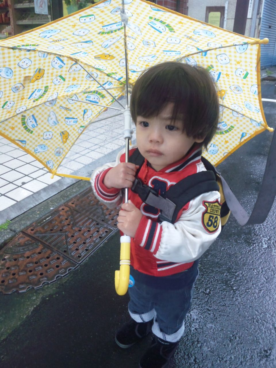 バギーにはのせず傘をささせて歩かせてみましたが、途中で嫌がって結局抱えて歩く羽目に。
