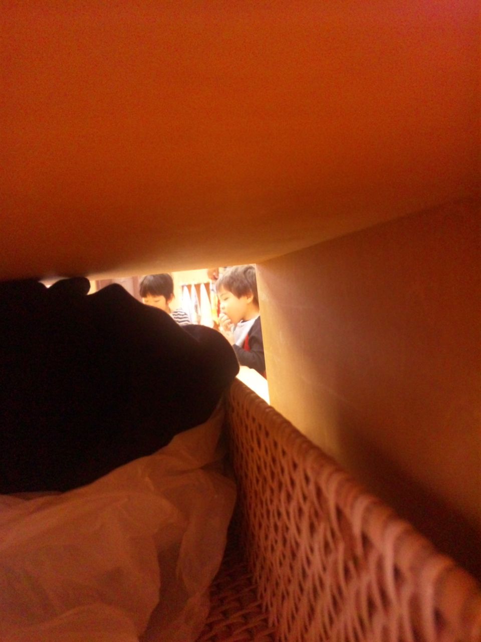 さてちぃ太郎のほうであるが、おやつを食べてる様子を見つからないよう、着替え入れの隙間から覗き見してました。