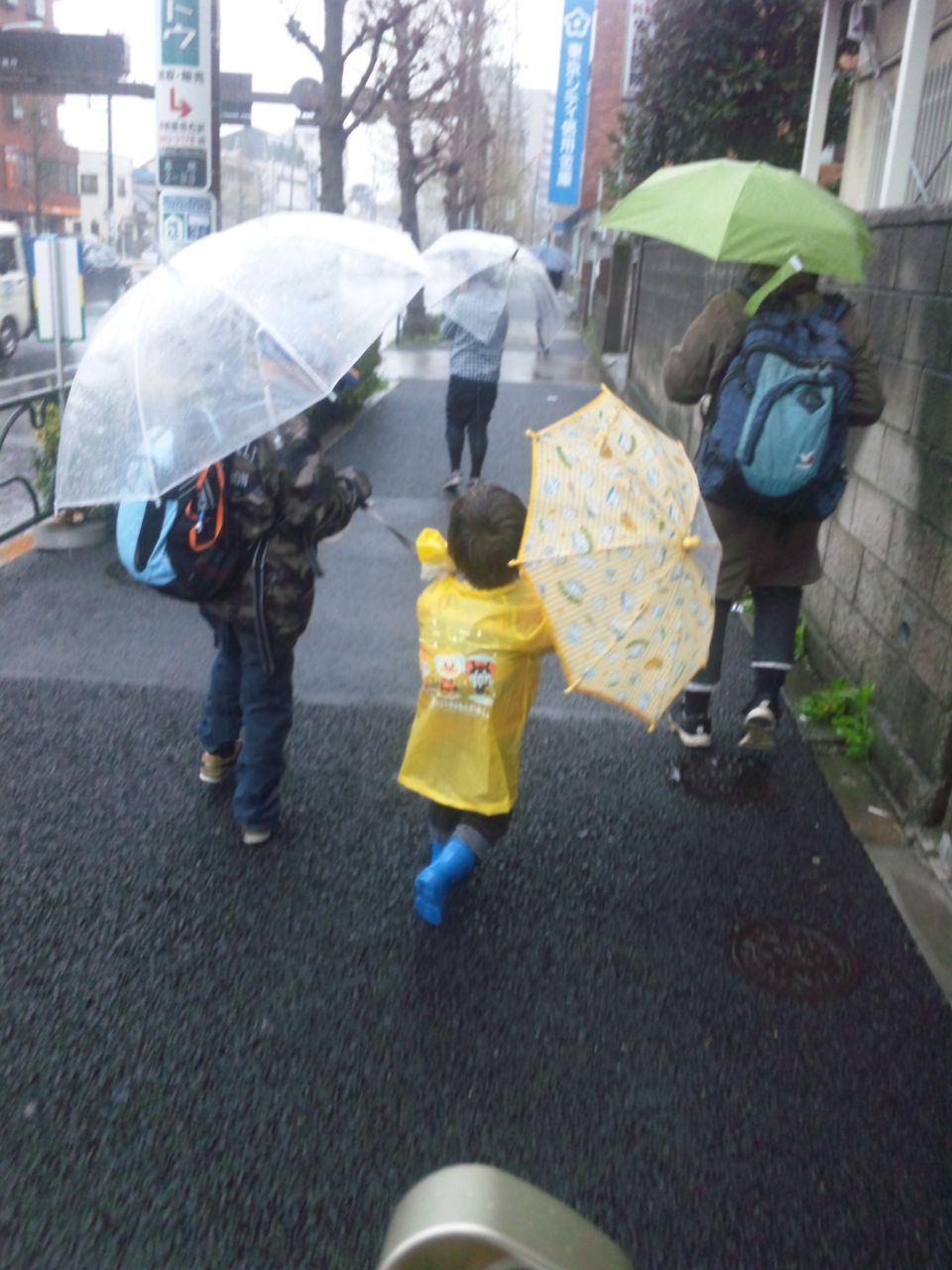 当初保育園を休んで姉一家を大宮までみんなで送り出すつもりであったが、ただならぬ雨=雨具で手が足りず一人で二匹の面倒は無理なので、天気予報で荒れる予報の時点で二人とも保育園に行かせるように変更。