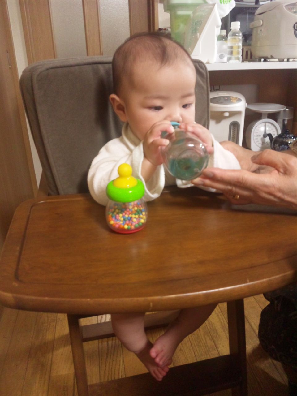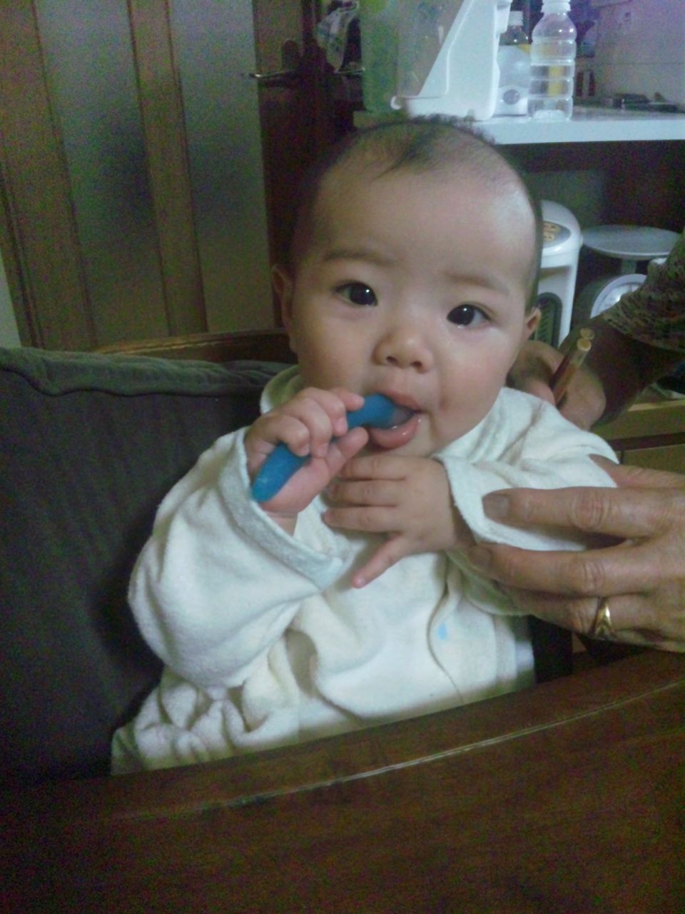 大人と同じ高さにいるのが楽しいらしく、シリコンゴムのスプーンをかじって食べる真似をしたがる。