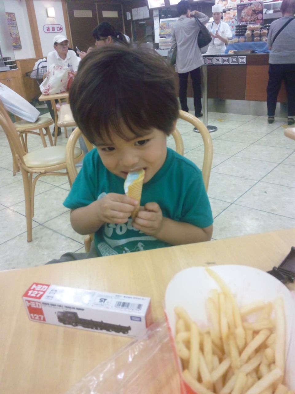 ちぃ太郎は今までソフトクリームはチビチビしか食べられなかったのに、最後になってコーンを食べたいというので、溶けたソフトクリームでベトベトになりながらコーン間食。