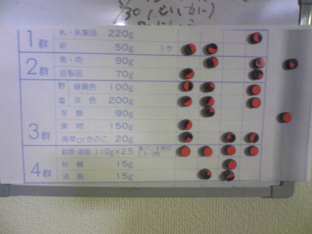 食べたもの書くのは非常に面倒臭いし紙を消費するので、ホワイトボードに拡大出力して、マグネットでおおよその量を朝昼おやつ夕とぺたぺた貼る。