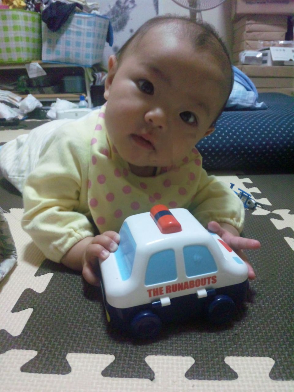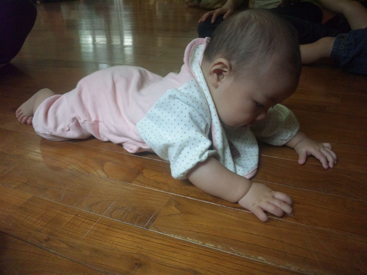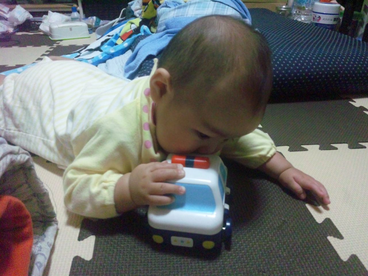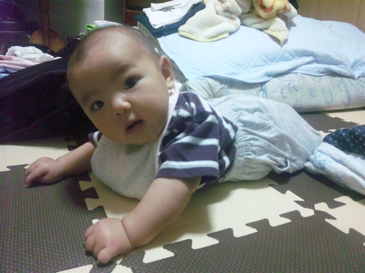 バウンサーから床に移って腹ばいで遊ばせたら、3分ぐらい頭を持ち上げつつけて遊んだあと、力尽きて頭をうつ伏せのままもがいてたので、慌てて仰向けに戻した。