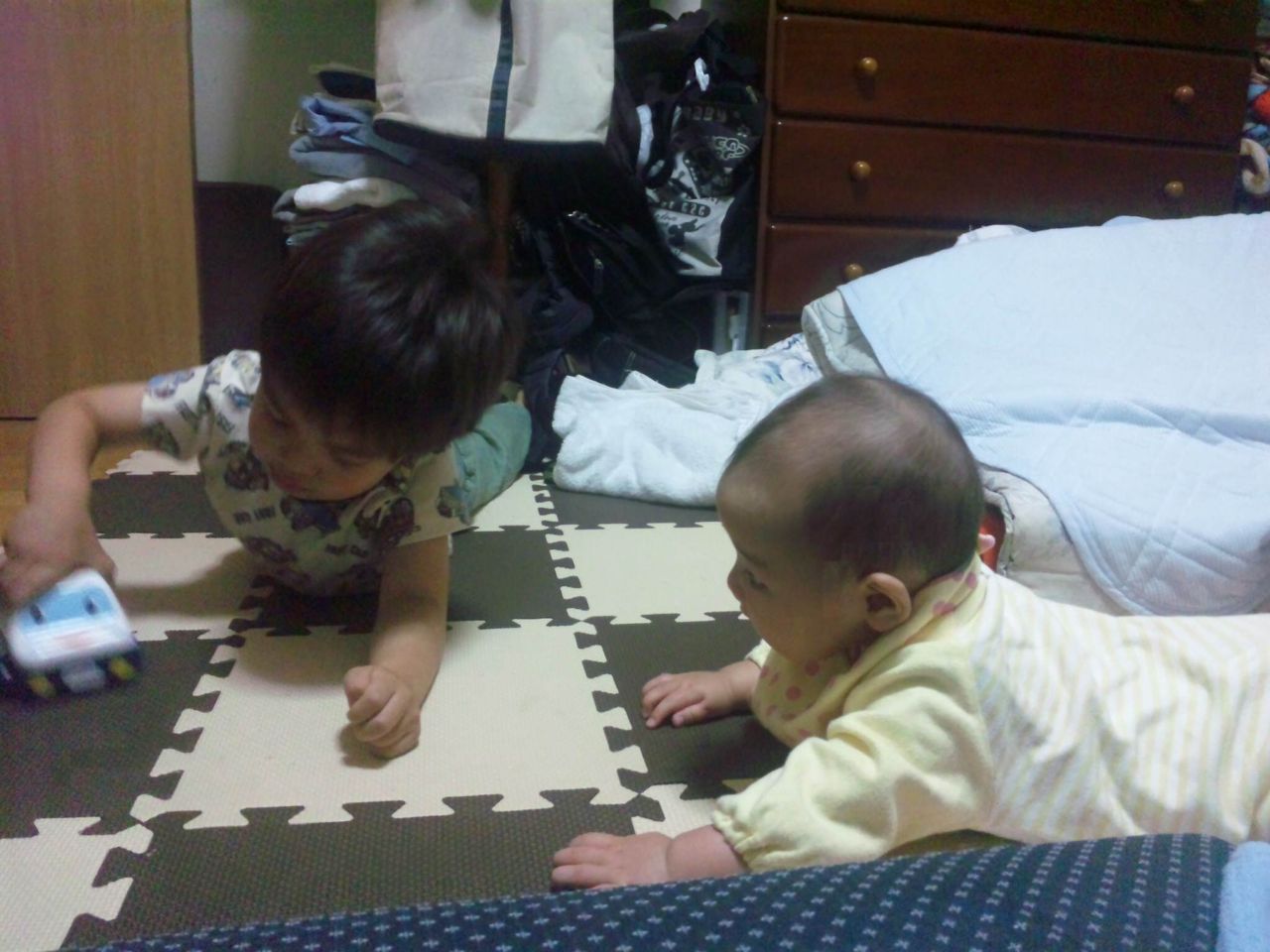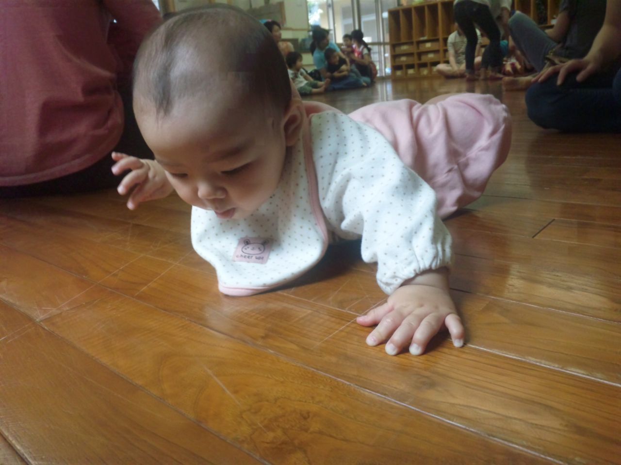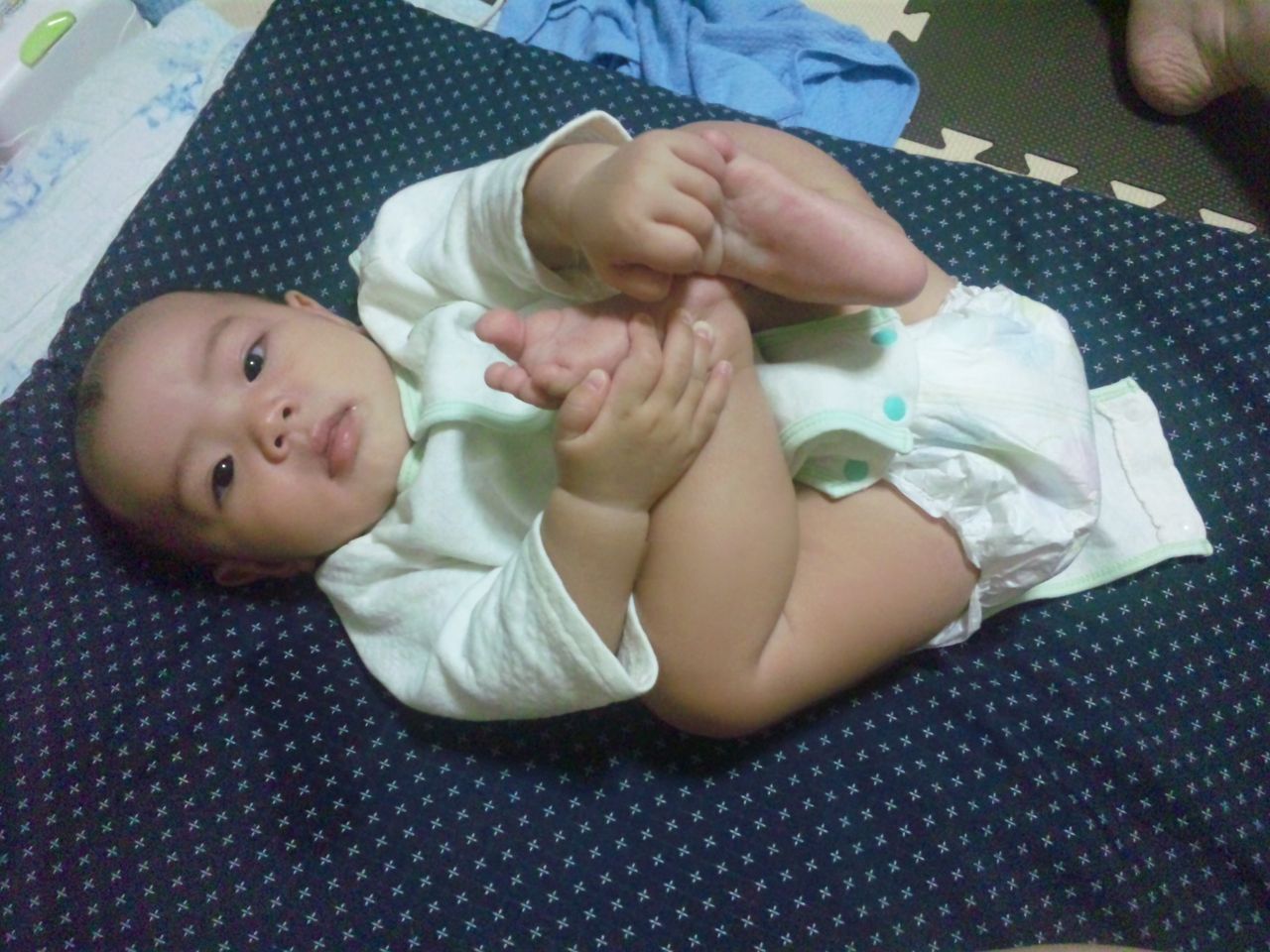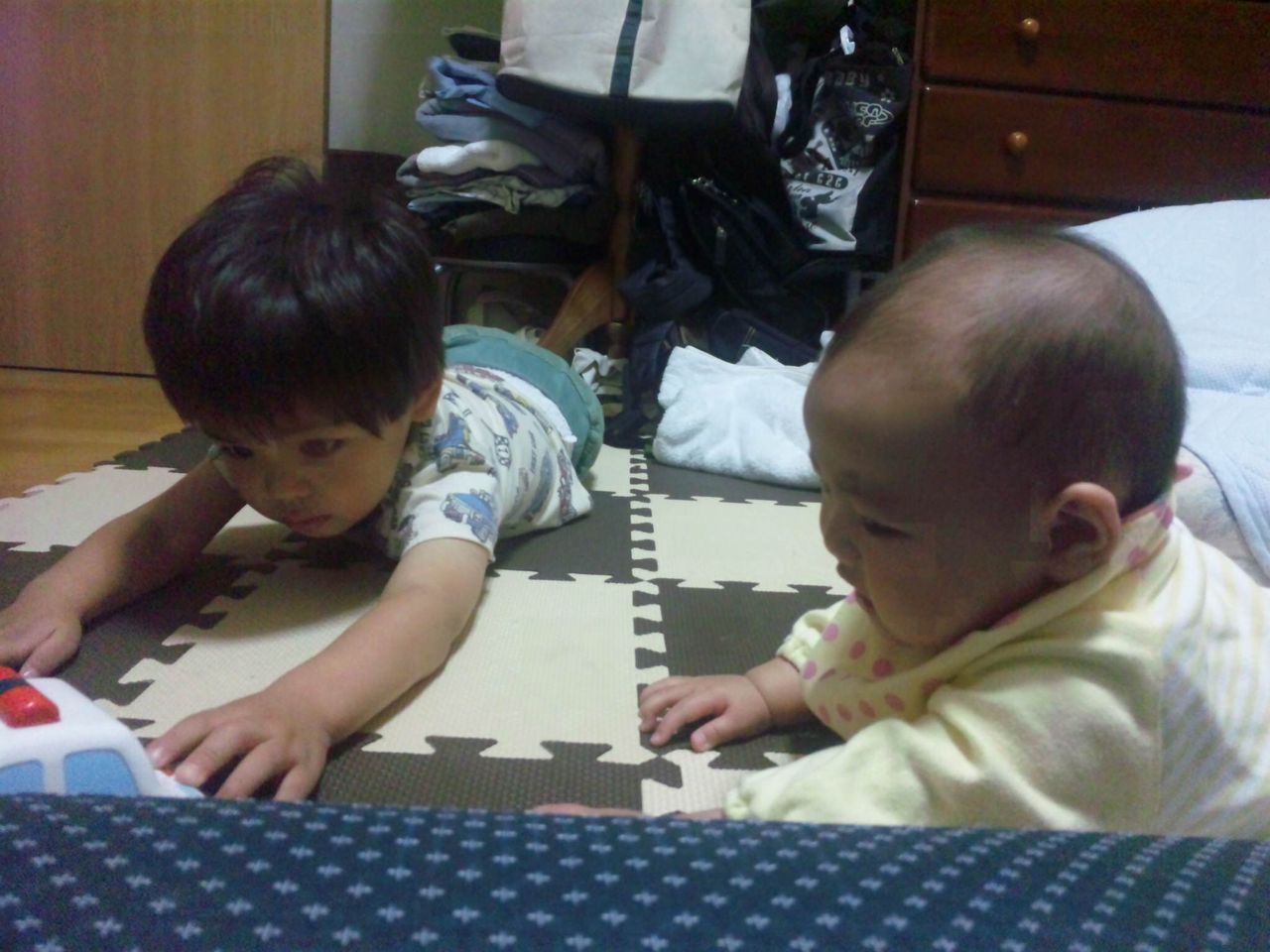 バウンサーから床に移って腹ばいで遊ばせたら、3分ぐらい頭を持ち上げつつけて遊んだあと、力尽きて頭をうつ伏せのままもがいてたので、慌てて仰向けに戻した。