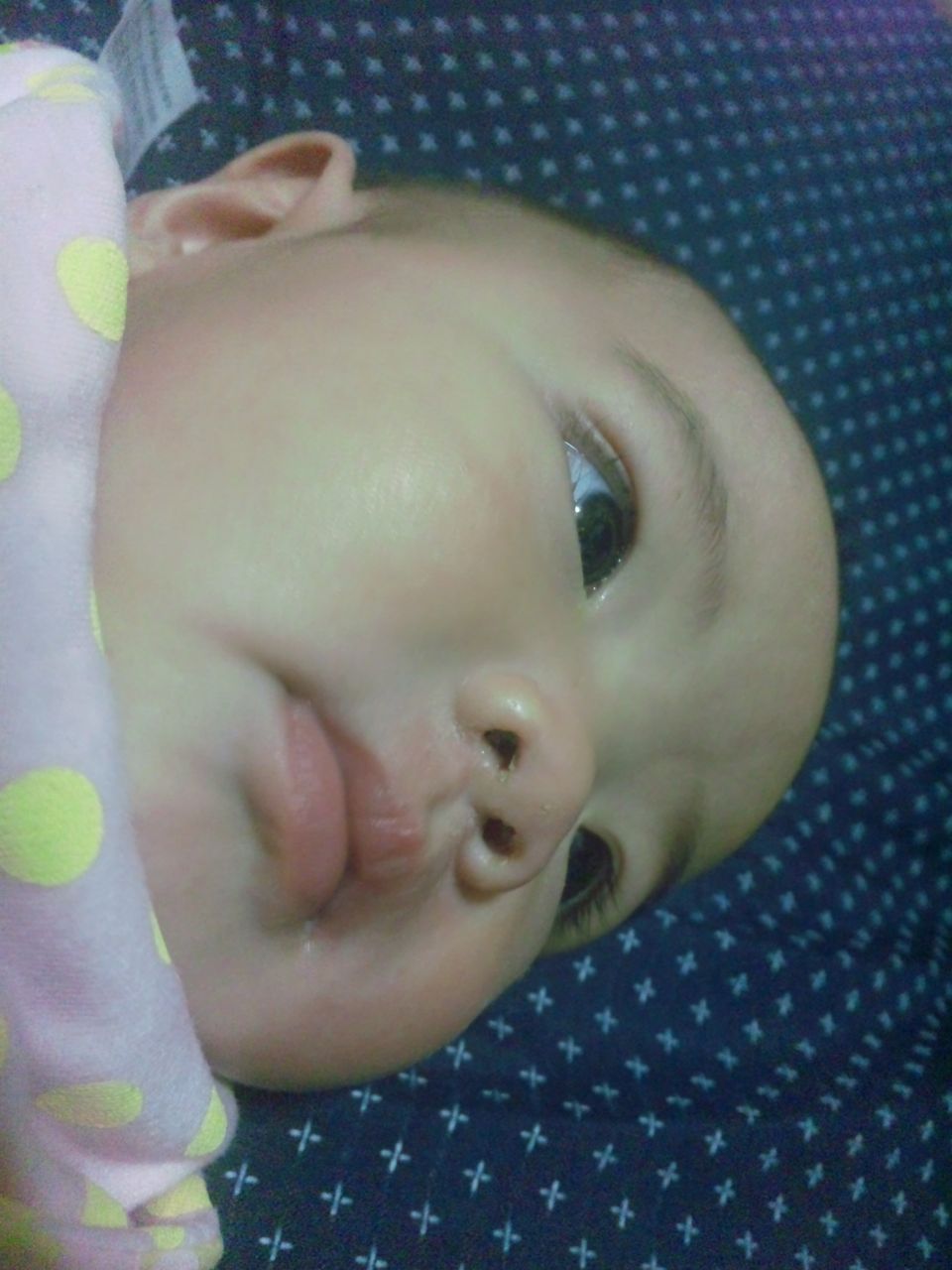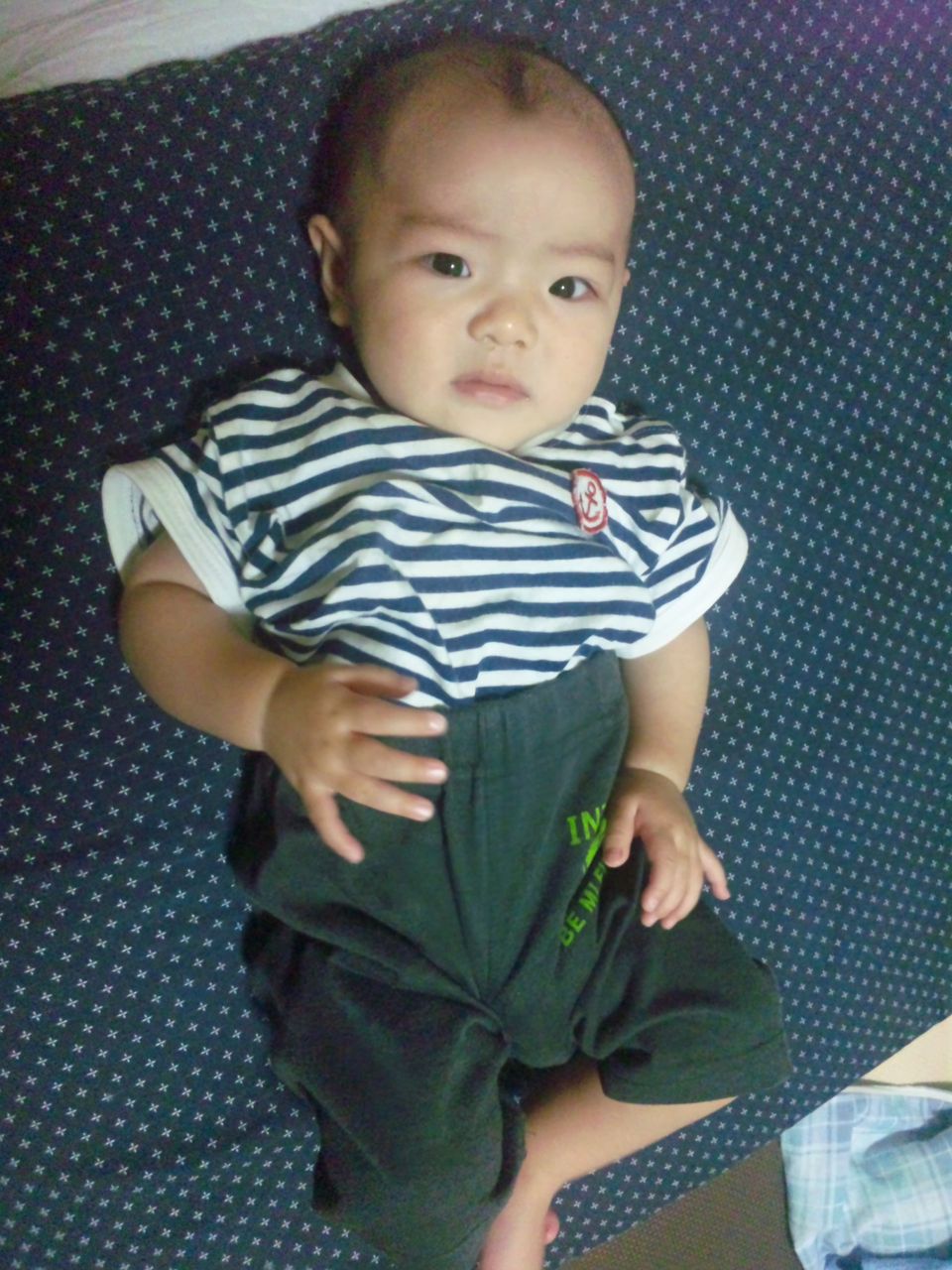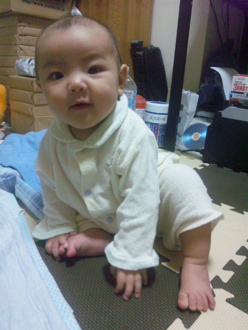不機嫌そうな顔なのは、帰宅したばかりで早く抱っこして欲しいと泣きそうになっているから。