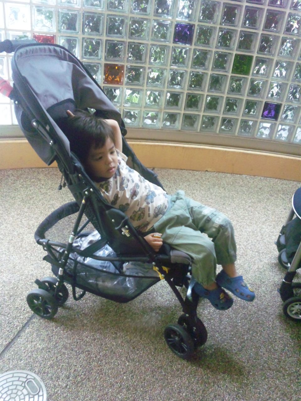 折しも新しいベビーカーは座面が広くなって乗り心地良いのか、自分から進んで乗るもののだらけた姿勢になってる。