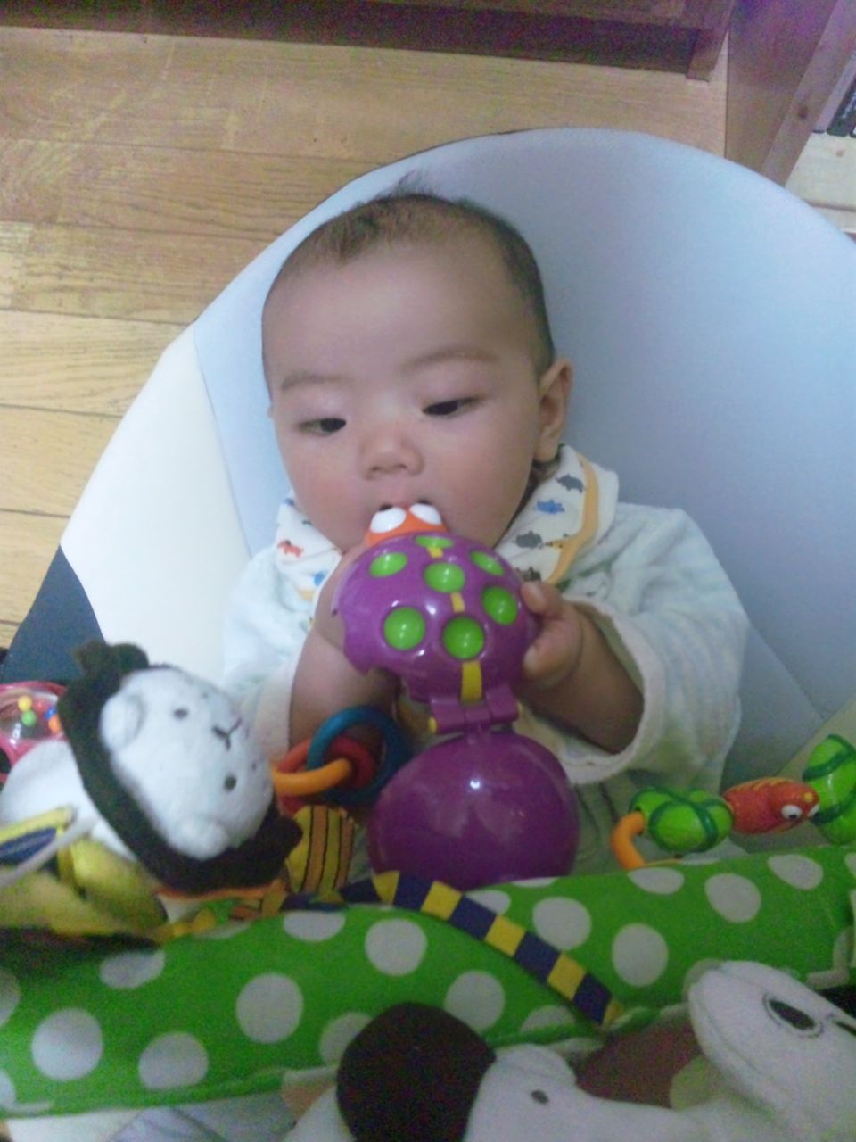 腹ばいにしても、前に進めず遊びが限られてしまうので、ちぃ太郎が5ヶ月目の時に買った知育玩具を引きずり出して掃除した。